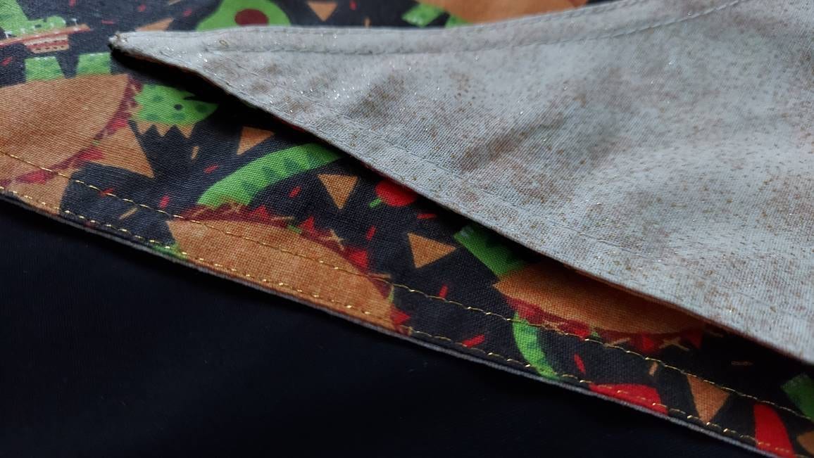 Depending on the fabric style, our bandanas are made of 2 reversible fabrics(Cotton, satin, or fleece) combined into one, giving you 2 different bandanas for a reasonable price! We finish the product with a double stitching and depending on the bandana prints, the thread stitching may be in a metallic gold or silver, which makes the final touch look superb!