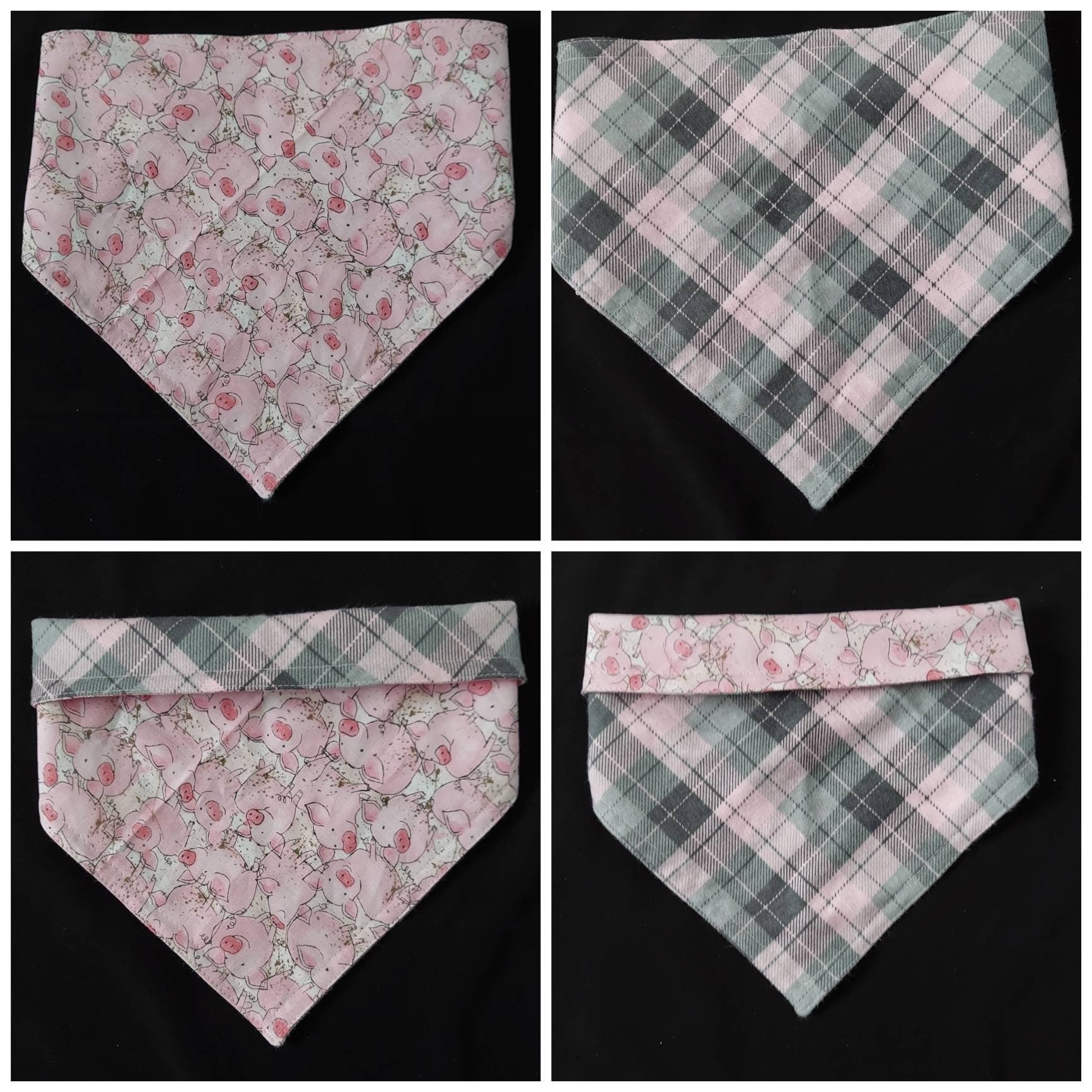 Depending on the fabric style, our bandanas are made of 2 reversible fabrics(Cotton, satin, or fleece) combined into one, giving you 2 different bandanas for a reasonable price! We finish the product with a double stitching and depending on the bandana prints, the thread stitching may be in a metallic gold or silver, which makes the final touch look superb!