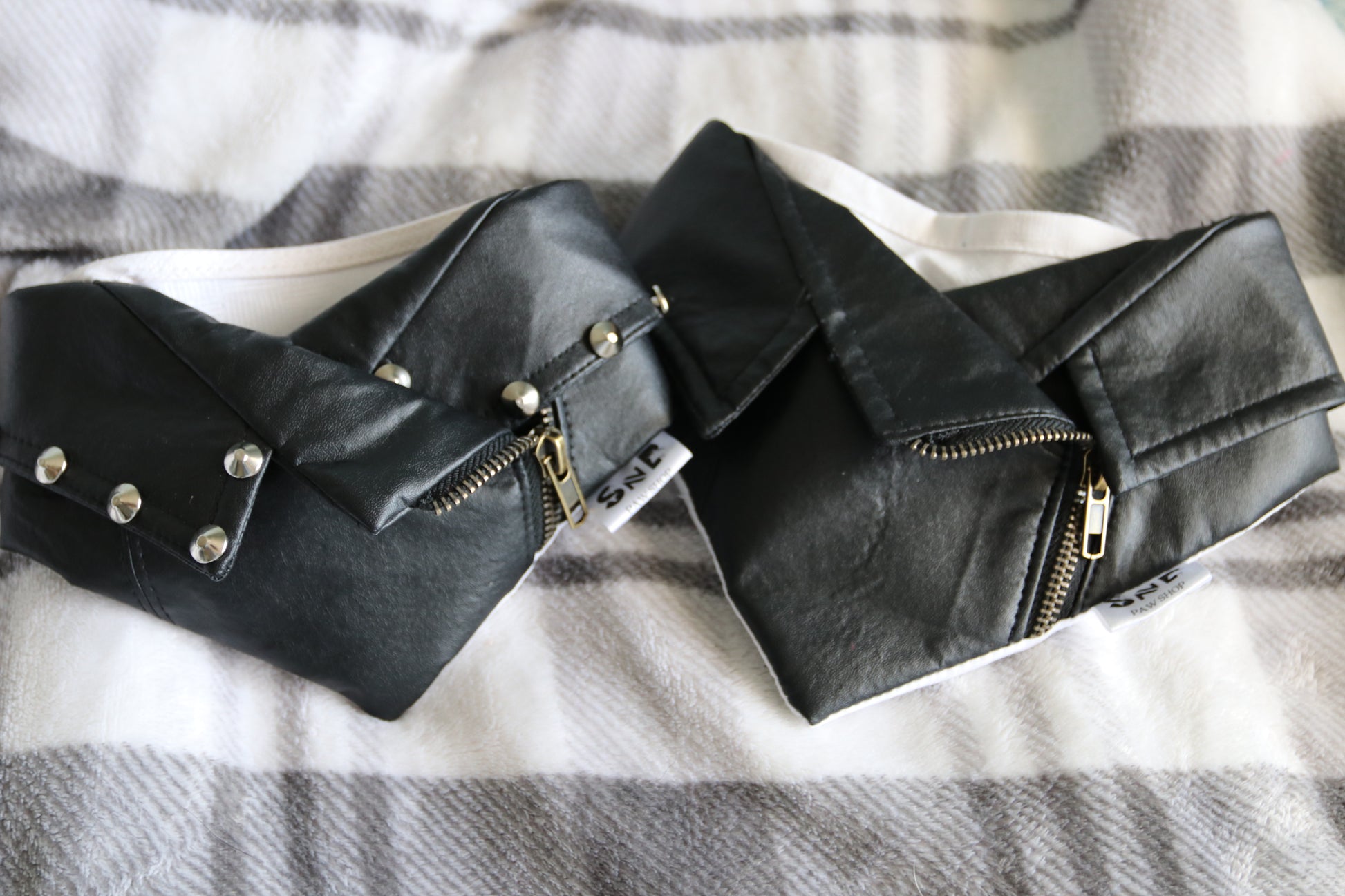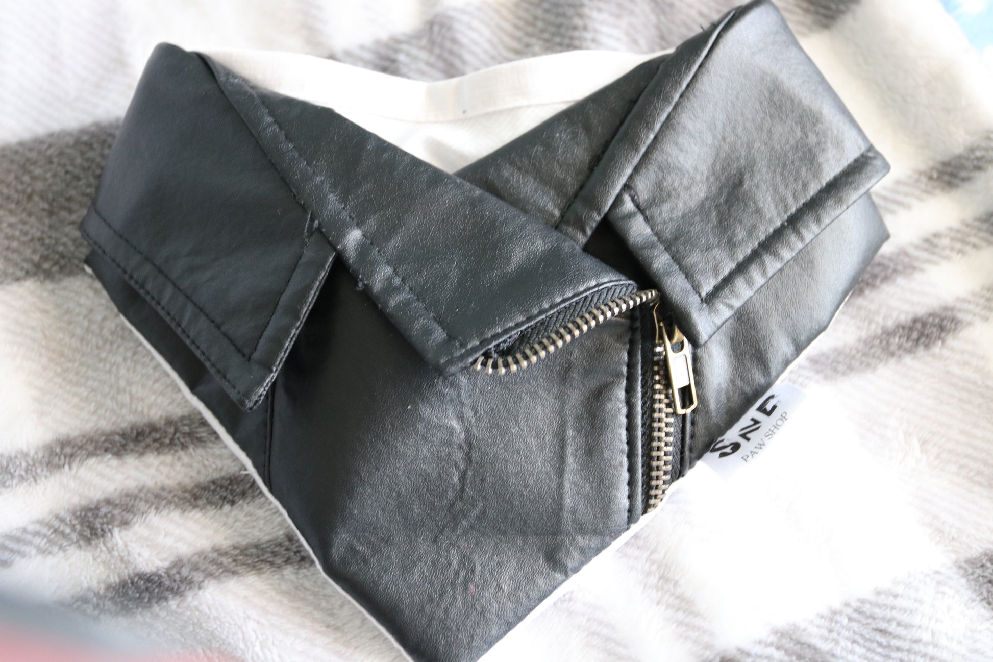 Let your pup live on the wild side with the Bad to the Bone Dog Bandana. Featuring a black faux leather jacket style, this bandana will make your furry friend the baddest dog on the block. (Warning: may encourage barks, howls, and rebellious behavior! 🐾🤘🏼)