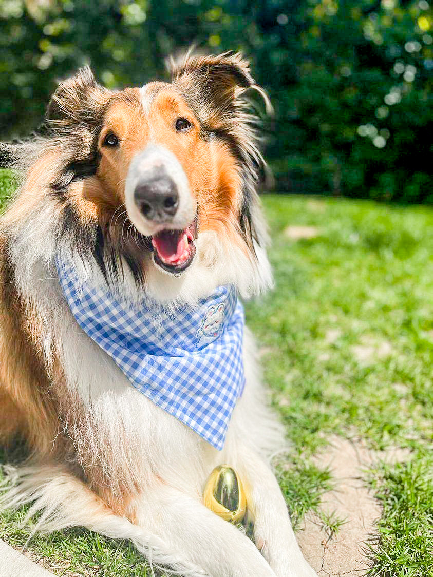 This print of gingham blue dog bandana is made of cotton and features an embroidery bunny patch. It's the perfect accessory for Easter and will keep your pet looking adorable during the spring season. This bandana will be your favorite!