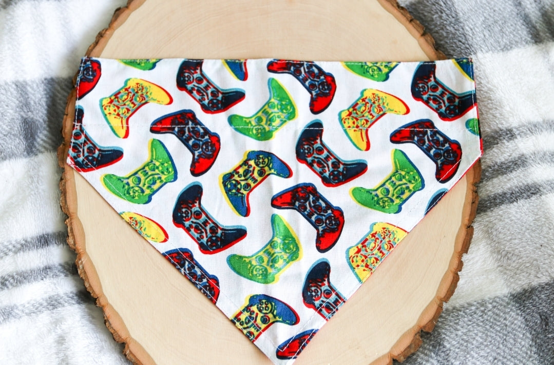 This bandana slips OVER the collar.