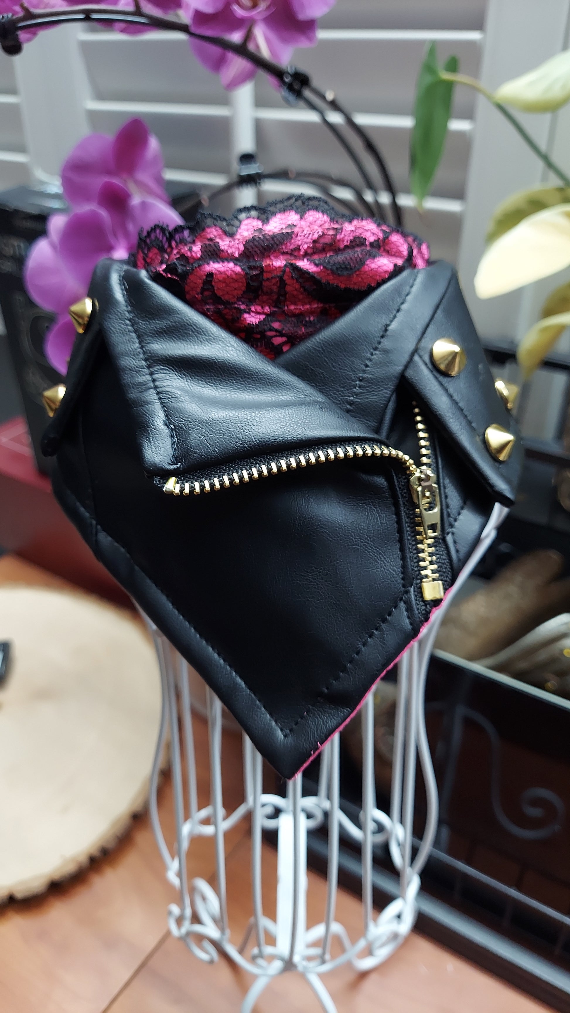 Let your pup live on the wild side with our Gemma Dog Bandana. Featuring a black faux leather jacket style and pink lace, this bandana will make your furry friend the baddest and fabulous dog on the block.