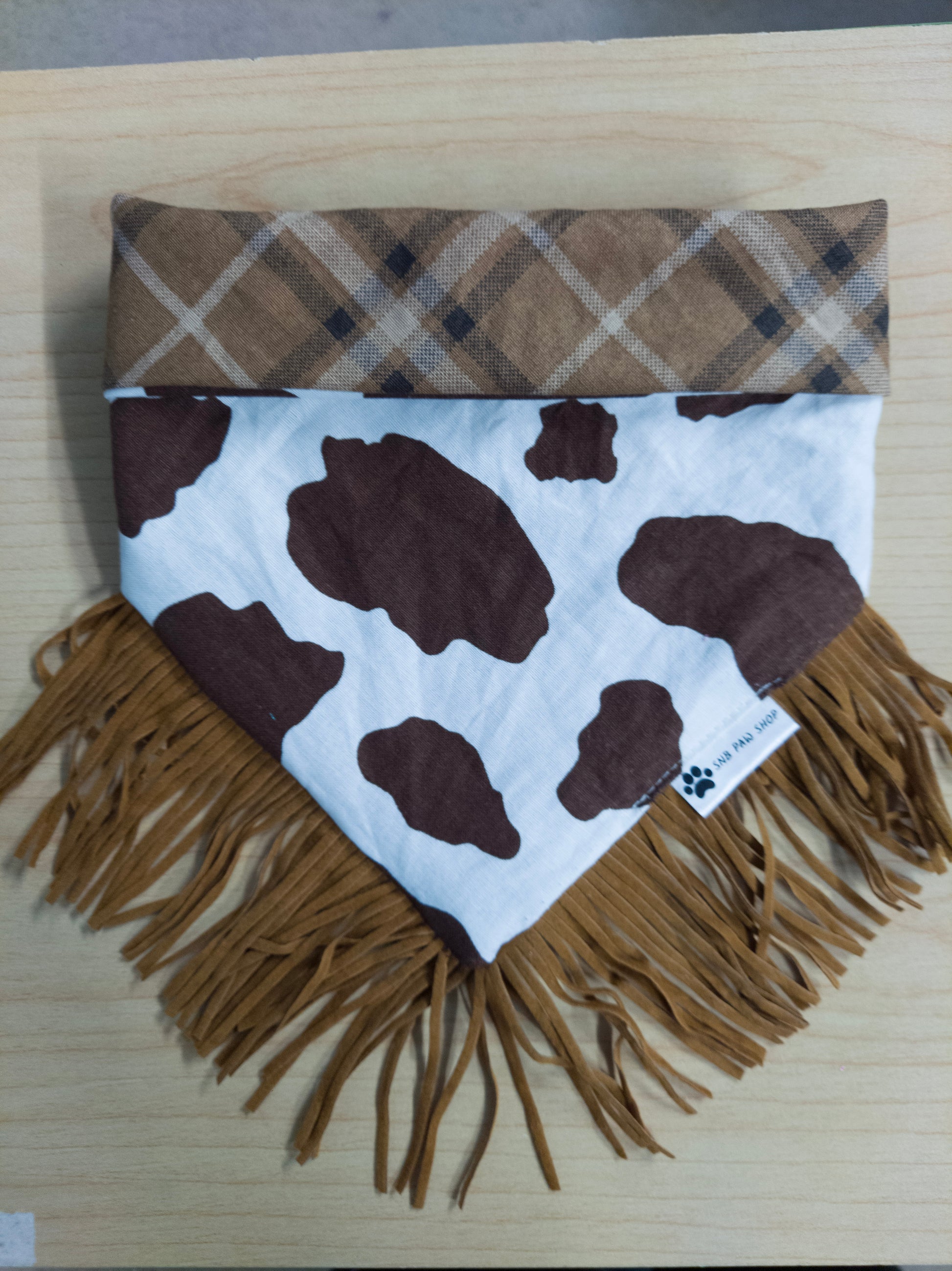 Depending on the fabric style, our bandanas are made of 2 reversible fabrics(Cotton, satin, or fleece) combined into one, giving you 2 different bandanas for a reasonable price! We finish the product with a double stitching and depending on the bandana prints, the thread stitching may be in a metallic gold or silver, which makes the final touch look superb!