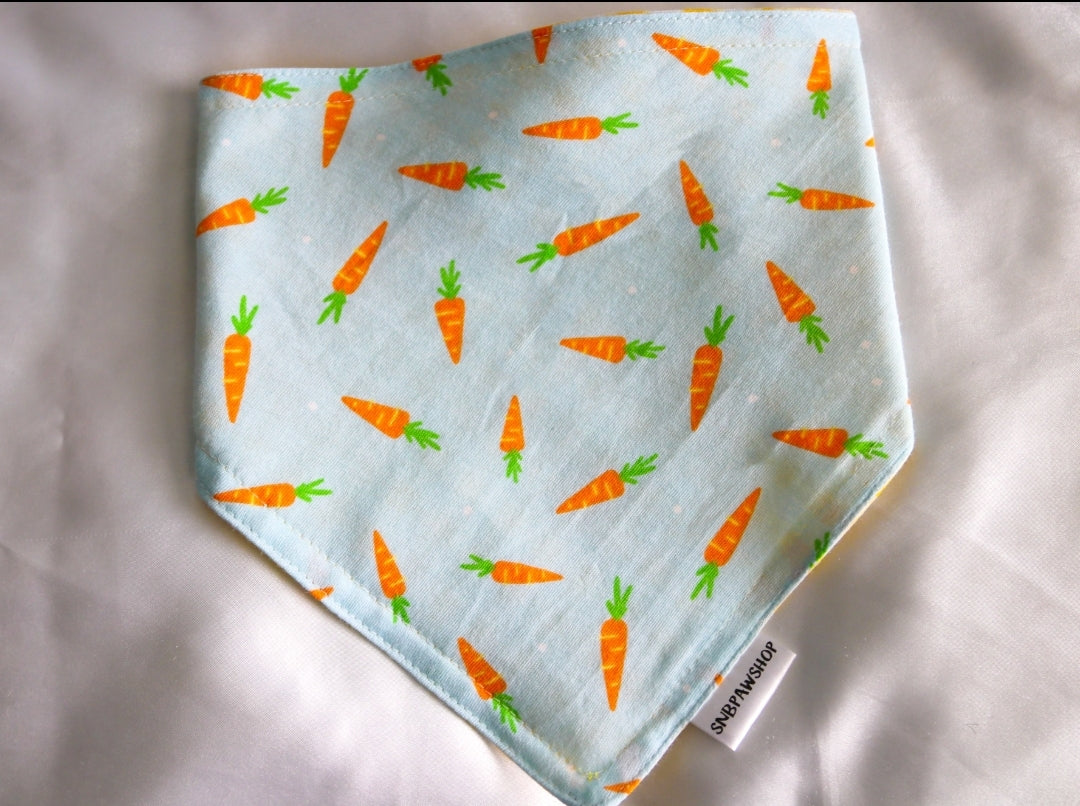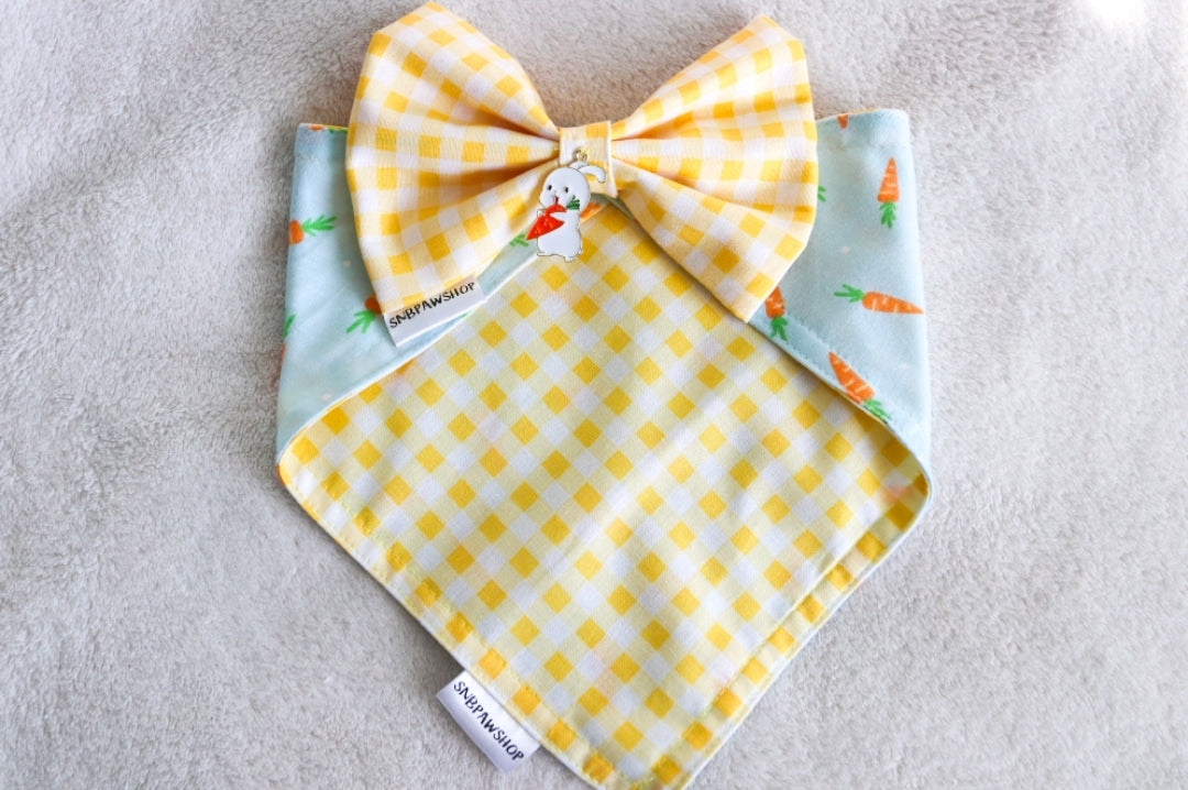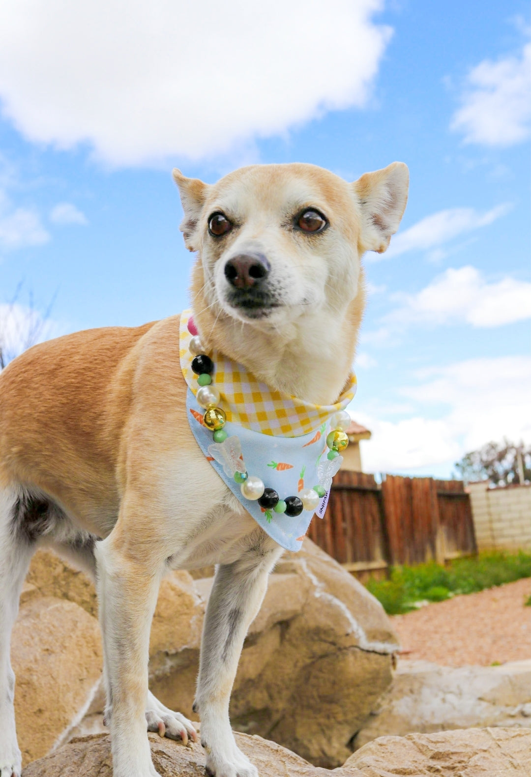 This print of gingham yellow dog bandana and cute carrots on the back is the perfect accessory for Easter and will keep your pet looking adorable during the spring season. This bandana will be your favorite!