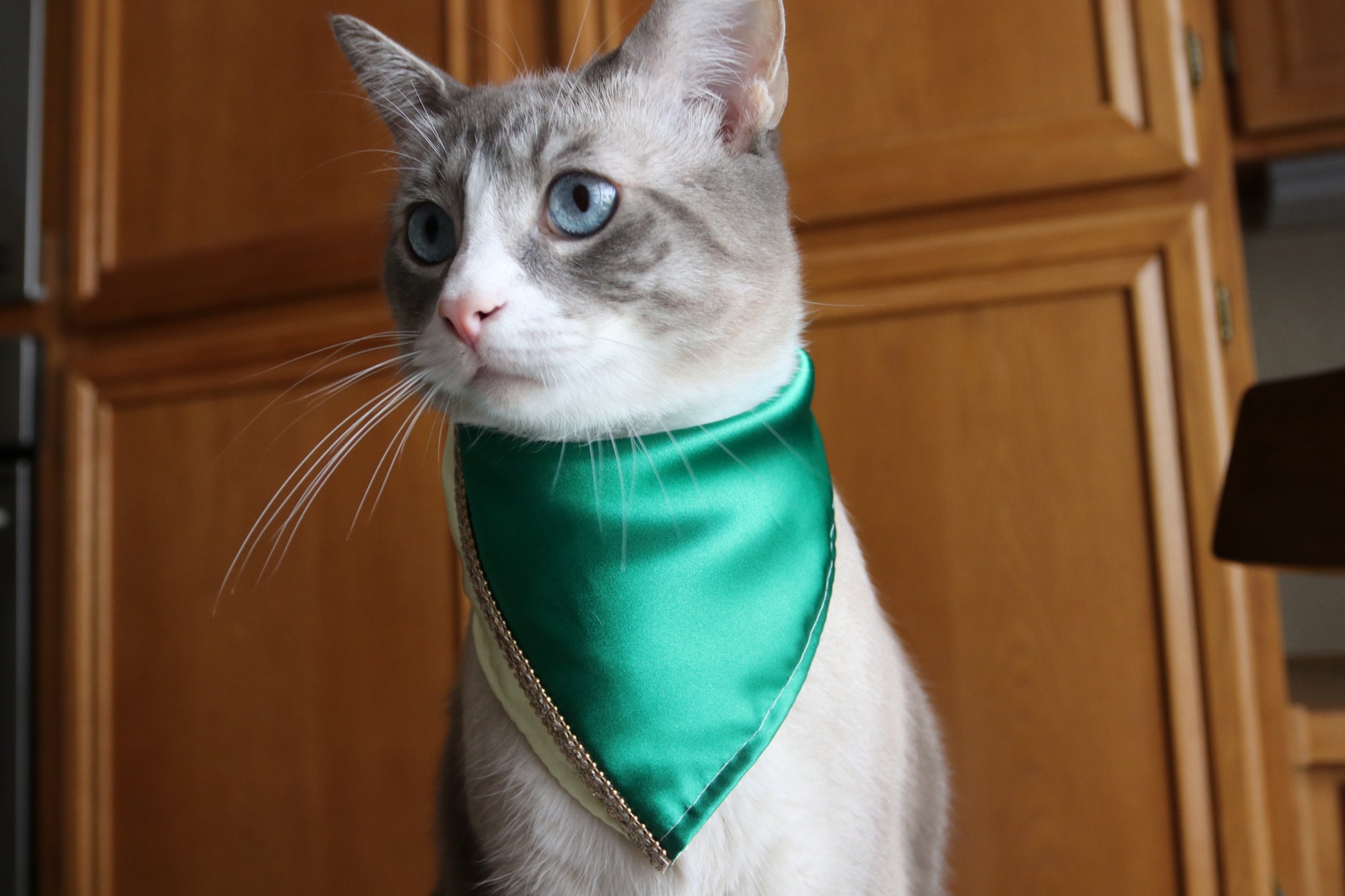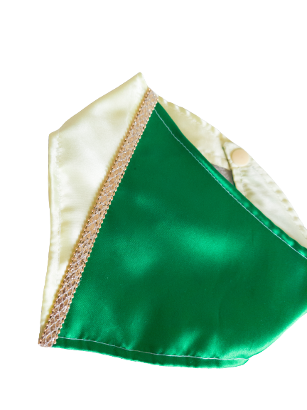 This bandana is part of our party set collection. It's made with satin fabric that's super soft. We add trimming that makes the final touch look very elegant.